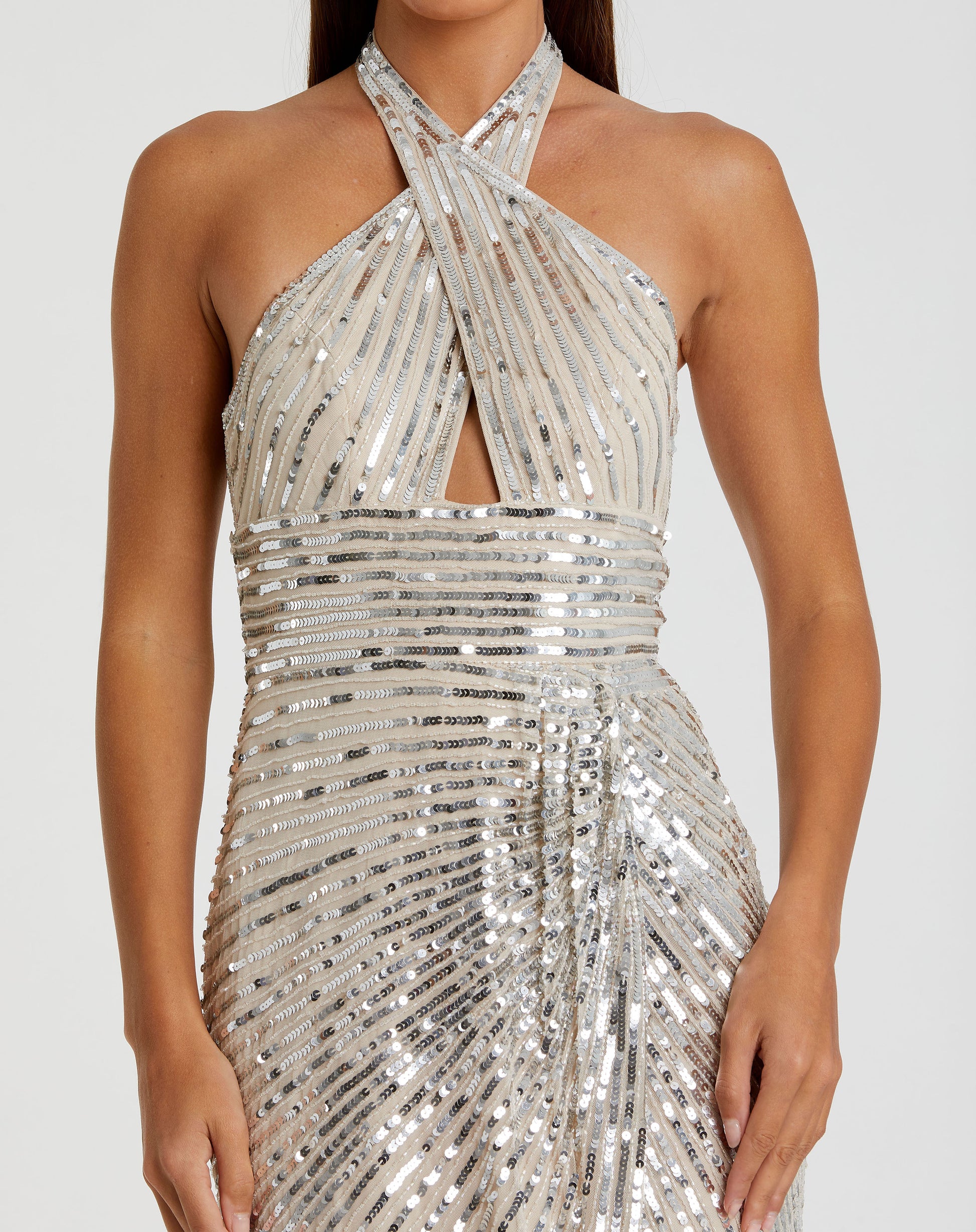 Crafted from sequin fabric, this dazzling column gown features a halter neckline, keyhole bodice cutout, and a thigh-high slit, exuding timeless glamour and sophistication for any occasion.