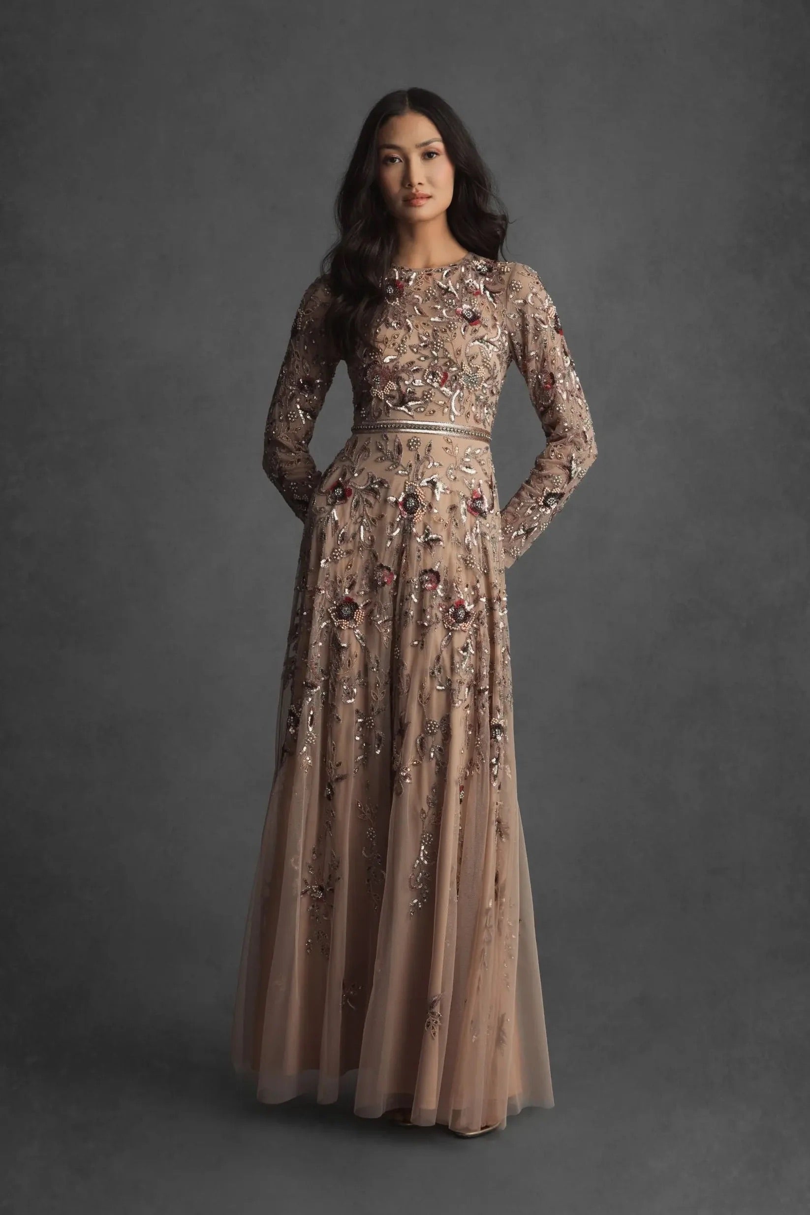 This Mac Duggal gown showcases exquisite craftsmanship with its embellished mesh construction in luxurious polyester. The design features an elegant high neckline and long sleeves, with a fully lined body for comfort and structure. Hand-sequined floral appliqués adorned with pearl accents create a stunning focal point across the silhouette, while a detailed embellished waist cinches the A-line silhouette for a refined, flattering fit. The unlined sleeves provide graceful movement and visual lightness. Perfect for formal occasions, this statement piece combines intricate beadwork with timeless elegance.